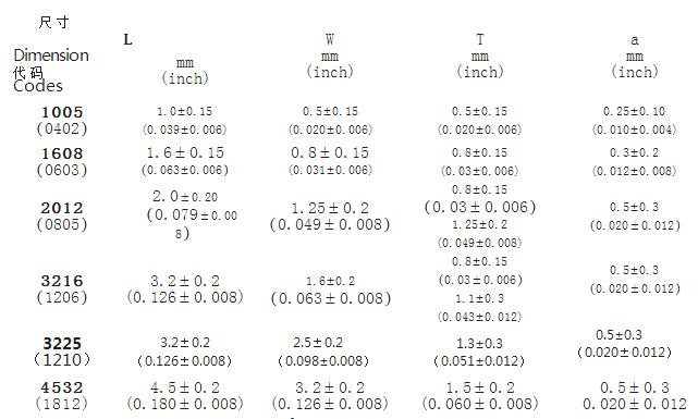 四、中高頻鐵氧體電感封裝尺寸列表: